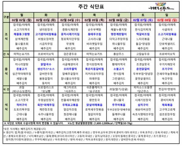 2월 첫째주 식단표 페이지 정보 작성자 은천노인복지회 작성일26-02-04 11:48 조회77회 댓글0건 관련링크 다음글 목록 답변 본문 2월 첫째주 어르신 식단표 안내해 드립니다. 정성과 영양을 담아 준비하겠습니다. 다음글 목록 답변